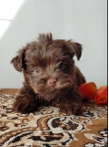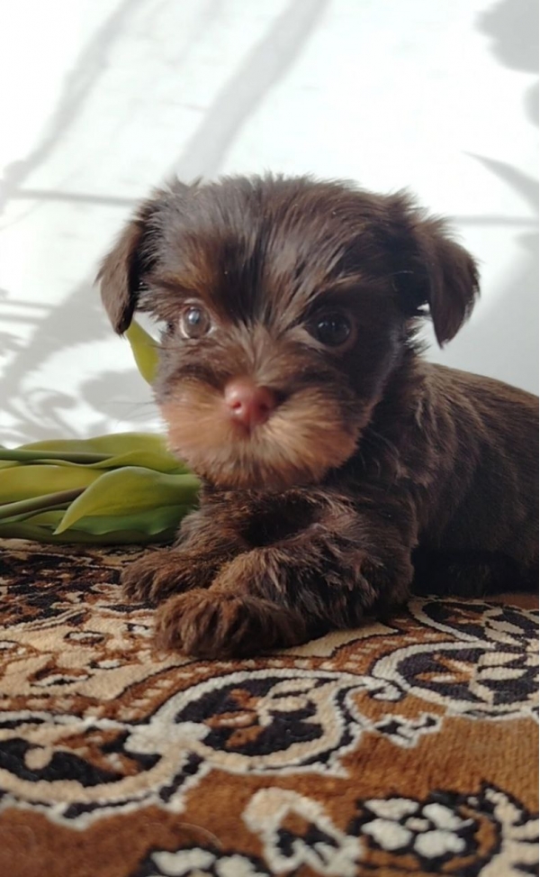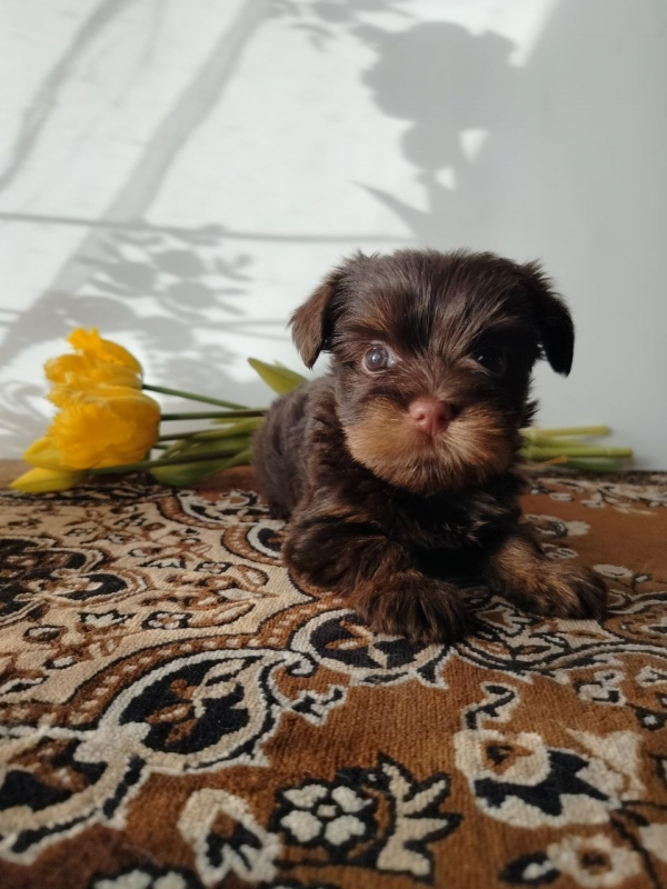 Цветной йорк шоколадного окраса с минимальным подпалом, родился 154 г, в 1 мес 510 г